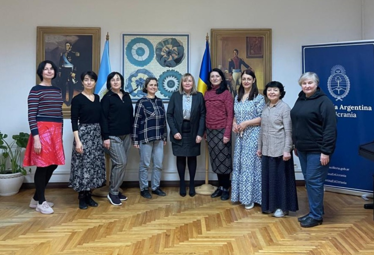 El programa se lleva a cabo en la sede de esta Embajada. Damos la bienvenida a la fundadora del "MISHKY MAYU", Dra. Iryna Korsak, y a la profesora, Dra. Liudmyla Zhukova, por su contribución profesional a la difusión de la cultura argentina en Ucrania.
